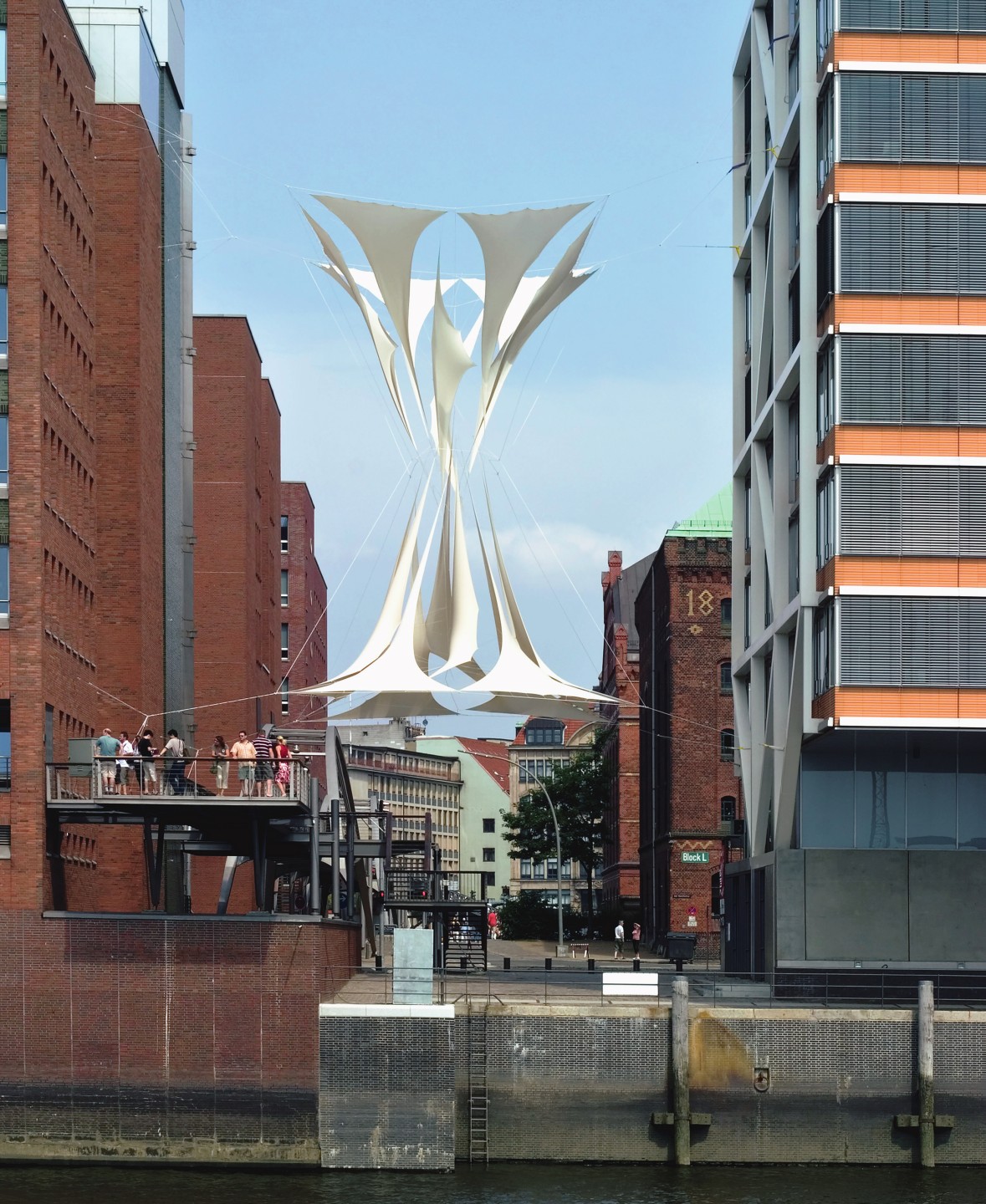 In 2006, art projects were initiated in the HafenCity Hamburg to culturally vitalize this new urban district. The Schwebende Archive, which were mounted in the form of an hourglass between two of the first new buildings, became a key project for this urban planning approach. “In the dark, the fabric surfaces are charged with history through projections of historical photos of the harbour. The present and the past are connected to form a sign of change that is visible from afar.” (Rolf Kellner)