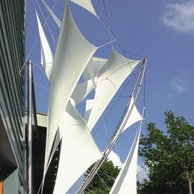 Die Installation Wishbone akzentuiert den Eingang eines Privathauses in Essen. Die Tragkonstruktion bezieht sich auf eine spezielle Riggform historischer Segelschiffe. Der Wishbone spreizt die Installation von der Wand weg und schafft gleichzeitig ein Volumen. Im Dialog mit der Architektur wird die Installation ein Teil der Fassade.